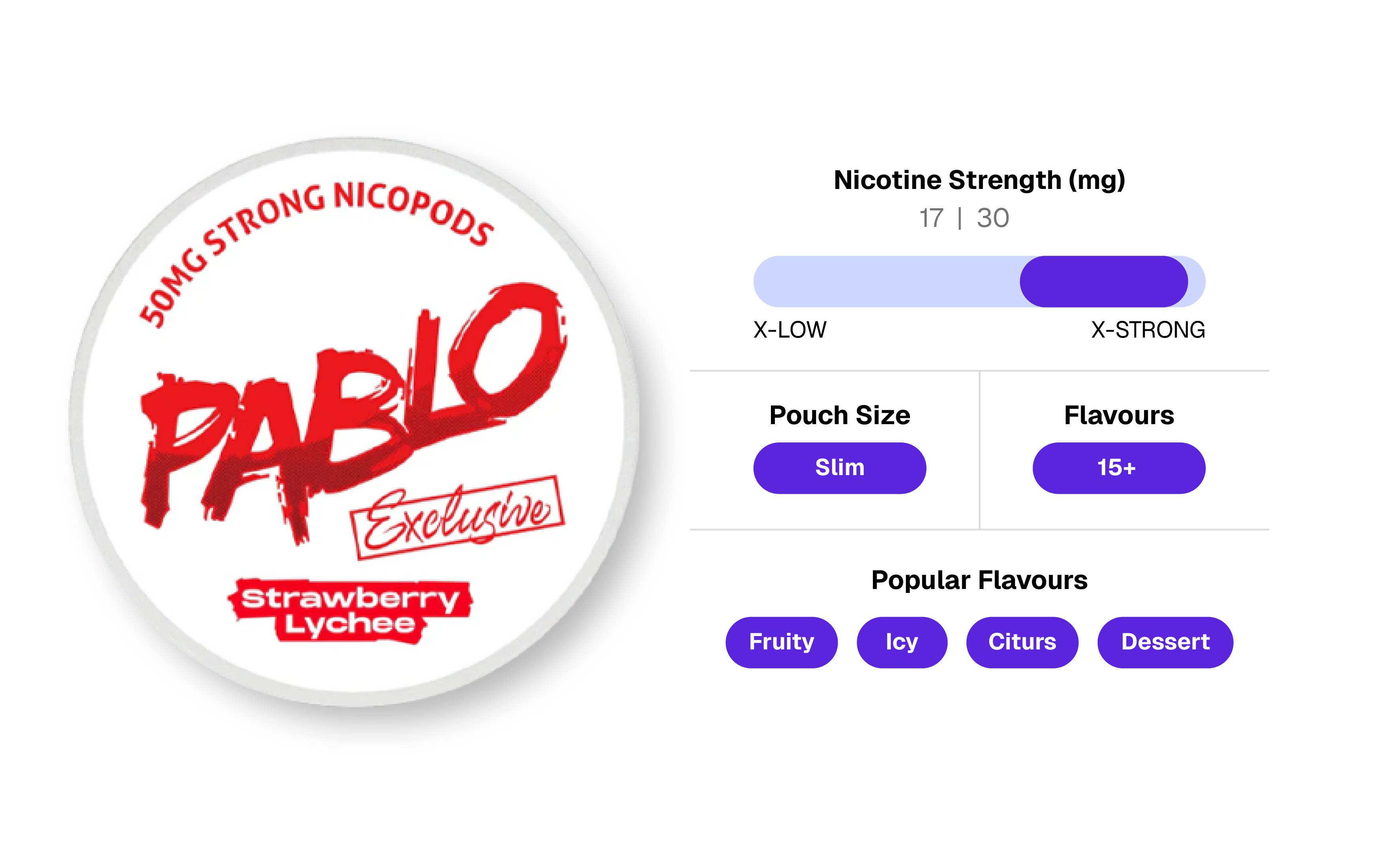 Discover Pablo Nicotine Pouches, one of the strongest nic pouch brands worldwide. Crafted for experienced users, Pablo pouches deliver a high-strength nicotine hit in a discreet, tobacco-free, smoke-free, and odourless format. With bold flavours ranging from icy menthols to fruity blends, each pouch is designed for maximum satisfaction. Stock up on popular favourites like the Pablo Exclusive 30mg and Pablo Gold Edition 17mg with our 3 for £10 multi-buy deal.