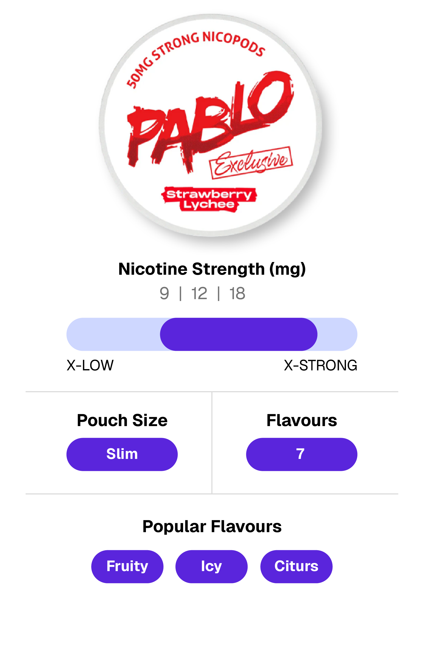 Pablo Nicotine Pouches are available in two nicotine strengths.