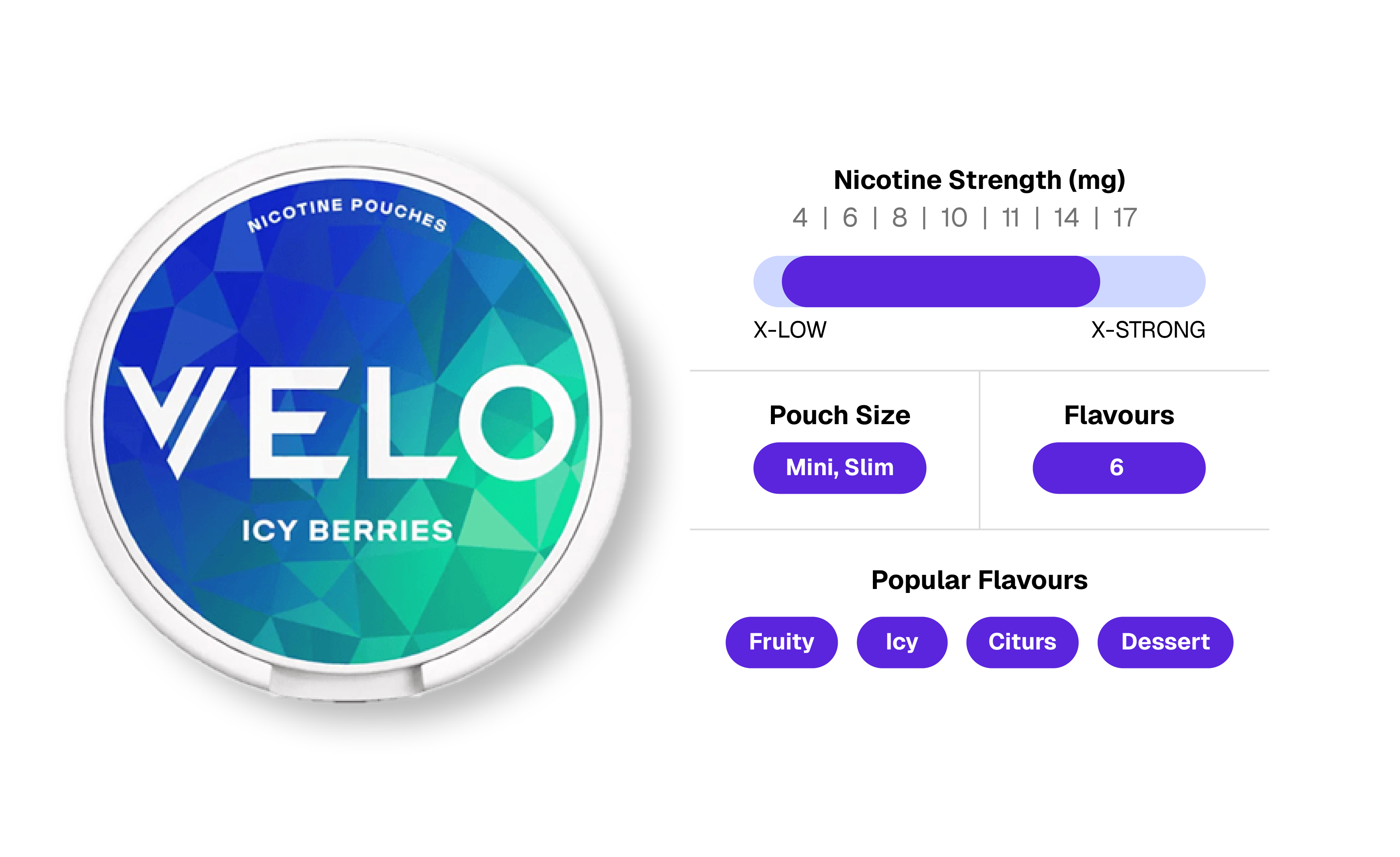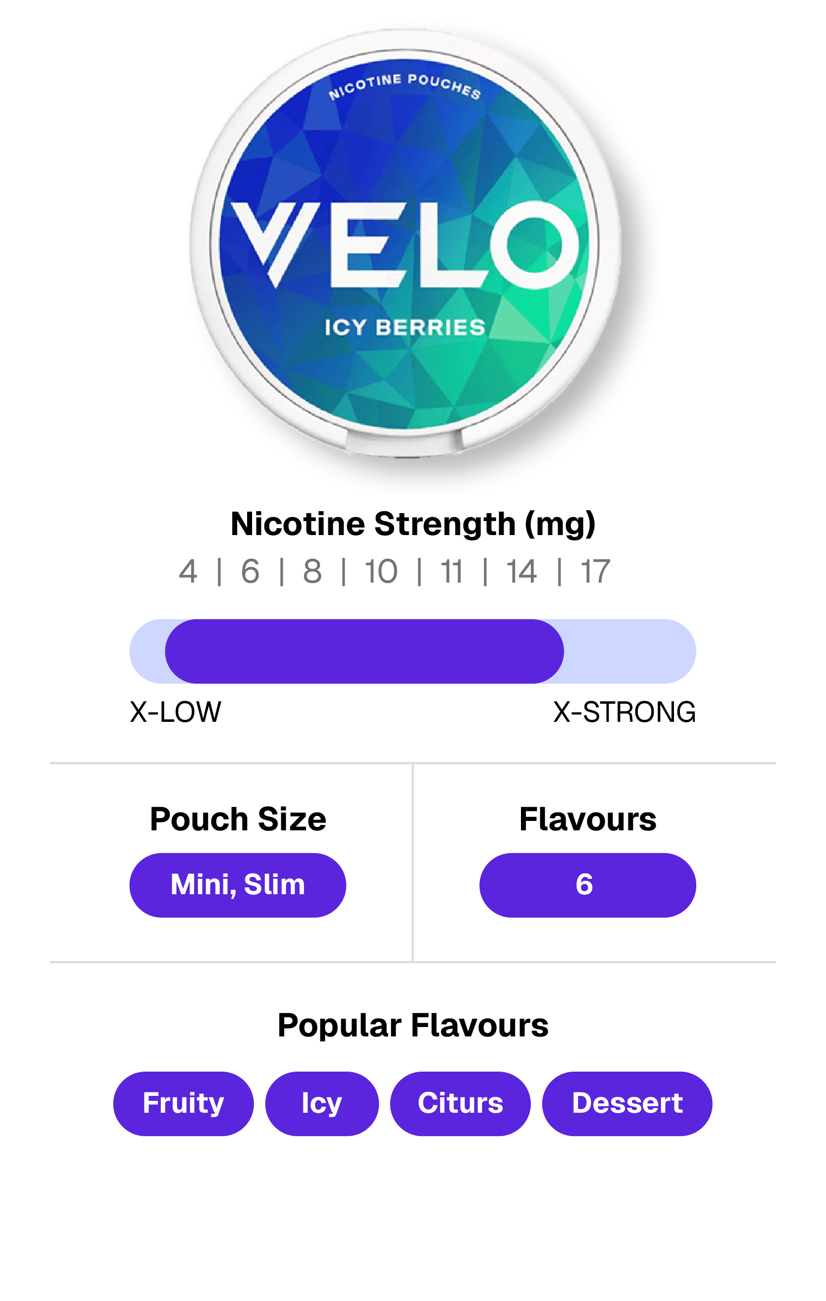 Velo Nicotine Pouches come in a wide range of strengths to suit every type of user, from those seeking a light, subtle experience to those wanting a powerful nicotine hit. The 4 mg/pouch option provides a gentle, light-strength experience, while the 6 mg, 8 mg, and 10 mg/pouch options fall into the regular range for a balanced and steady effect. For those who prefer a stronger impact, the 11 mg and 14 mg/pouch options deliver a pronounced hit, and the 17 mg/pouch variety offers an extra-strong experience for users looking for maximum intensity.